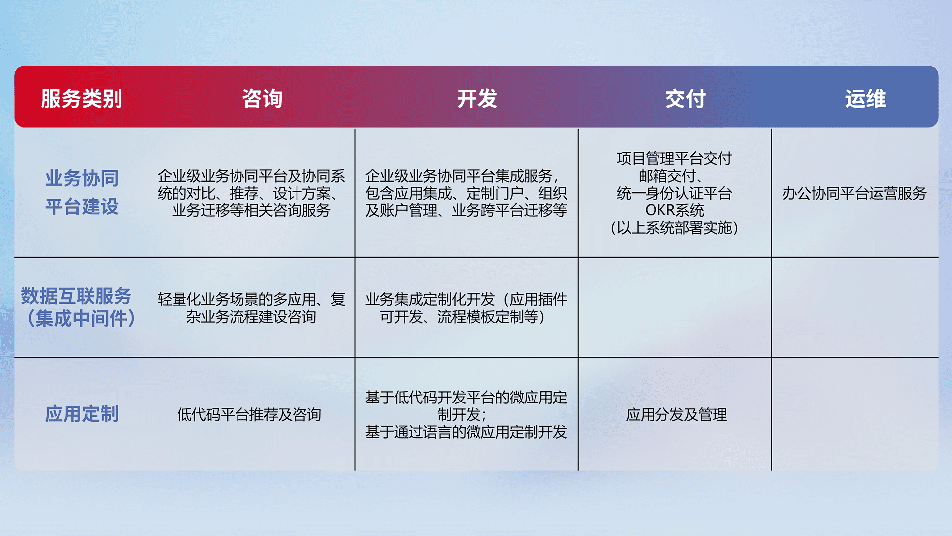 针对钉钉、、、企微、、、、IDaas等平台级产品提供产品的规划、、、、方案、、、交付、、、定制化开发等服务,,实现如统一协同办公、、智能客户服务、、、混合会议管理、、、智能数据查询、、等业务场景,,,,实现数字化转型。。