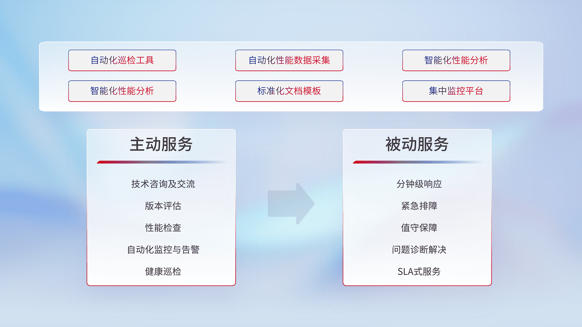 智能化工具和标准化文档,,,,保障服务质量,,,提供主动服务(包含技术咨询、、、版本评估、、、、性能检查、、、自动化监控与告警、、健康巡检)和被动服务包含(分钟级响应、、紧急排障、、、、值守保障、、、、问题诊断解决、、SLA服务)。。。。